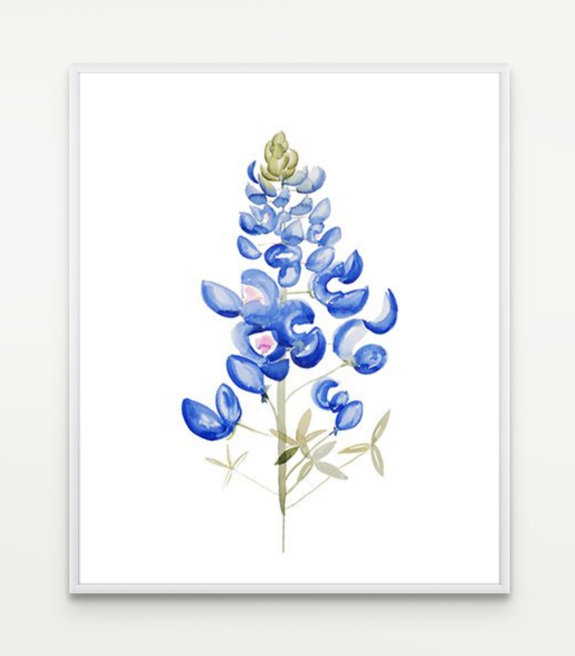 About the Painting: Original Bluebonnet Watercolor on paper. 24x36 inches framed in a simple white frame. This painting is very vibrant in real life, it will definitely make any wall POP!